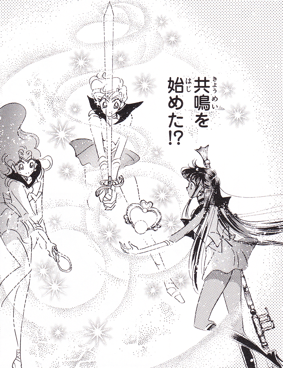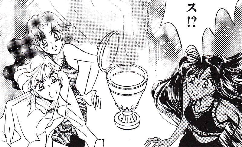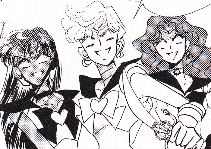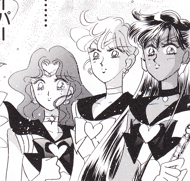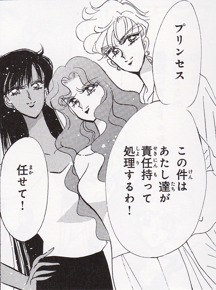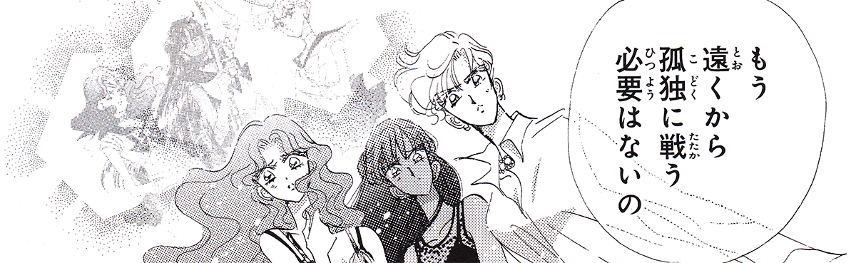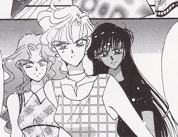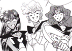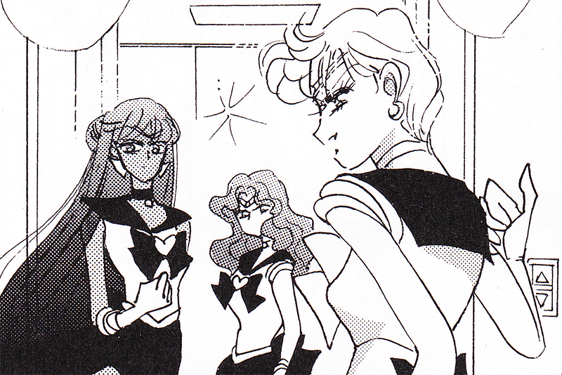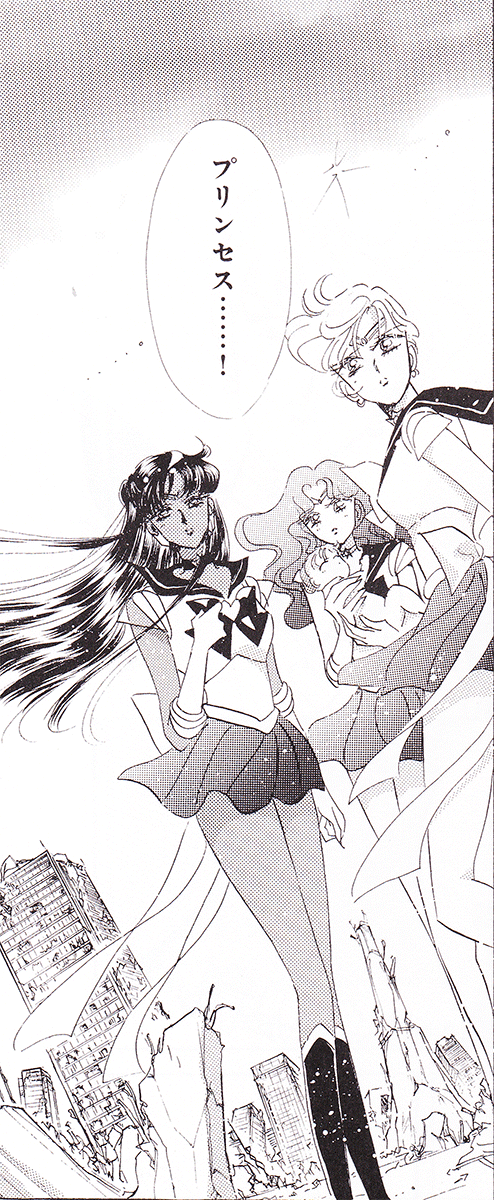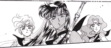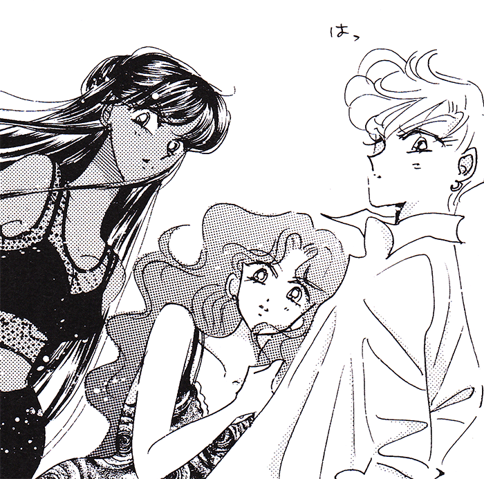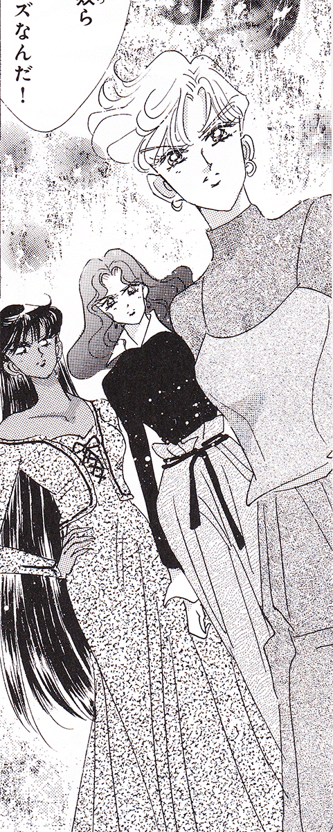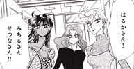 Black & white manga images of Haruka, Michiru & others.