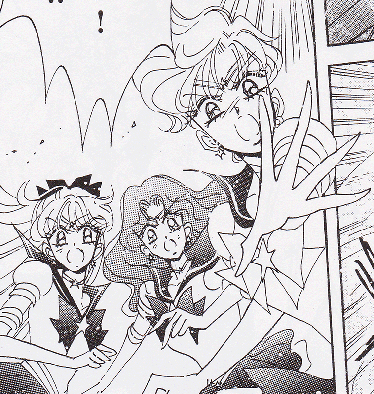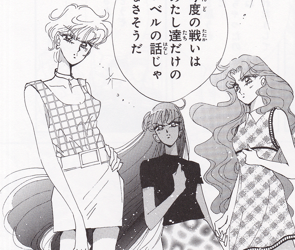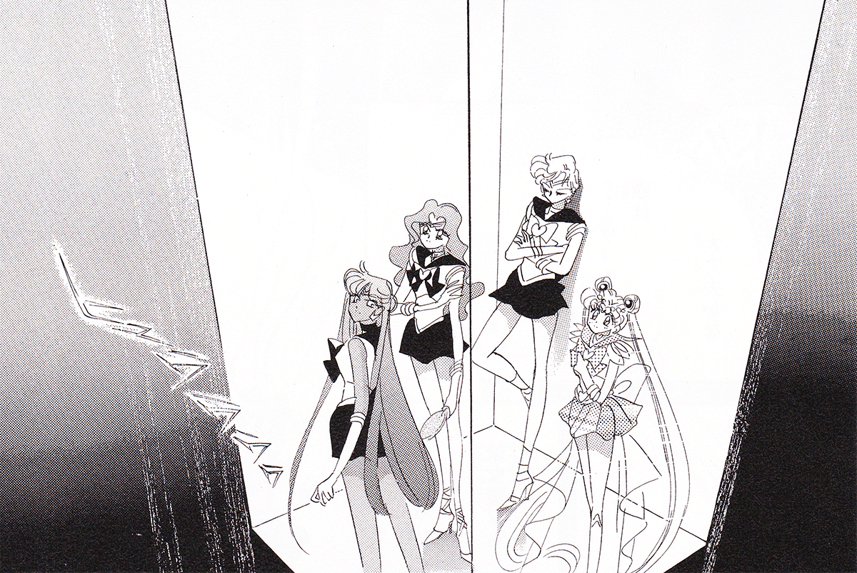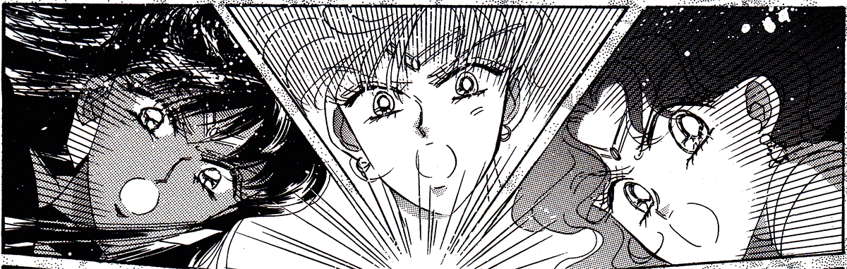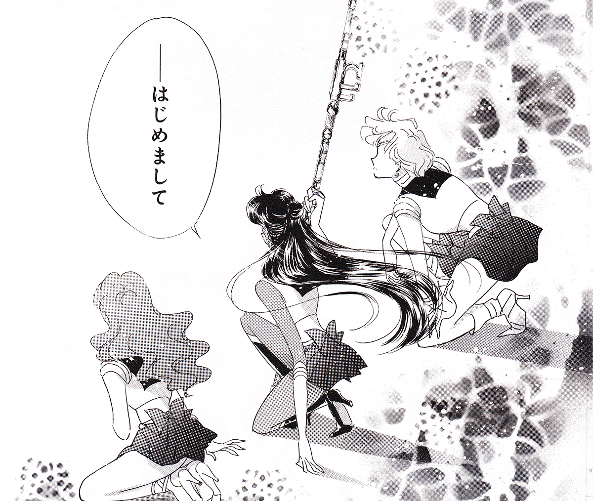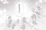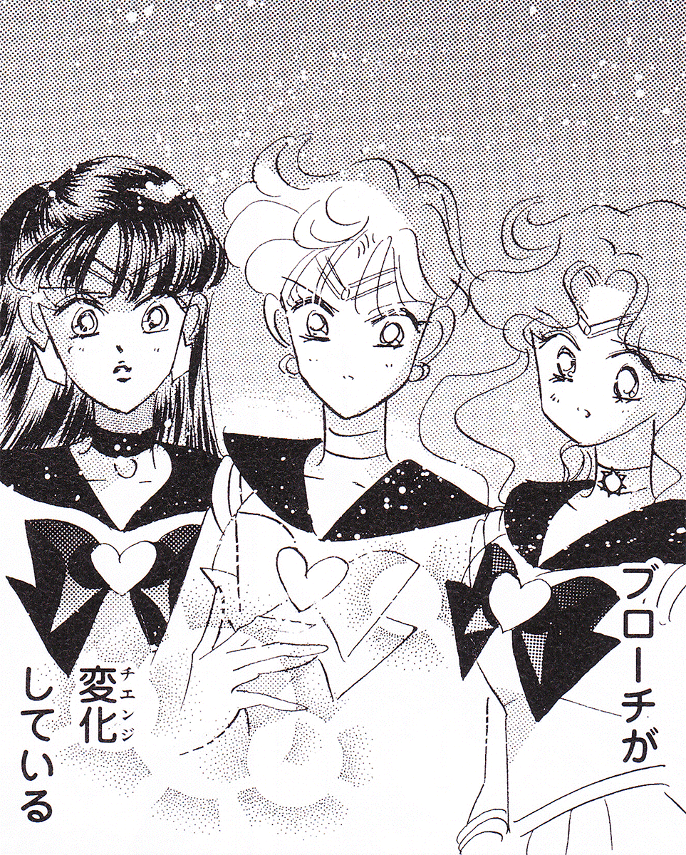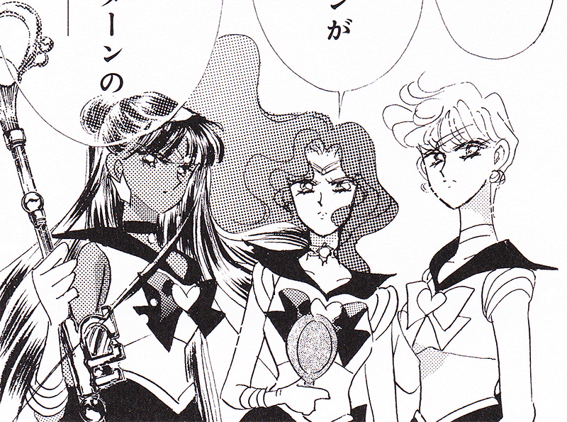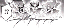 Black & white manga images of Haruka, Michiru & others.