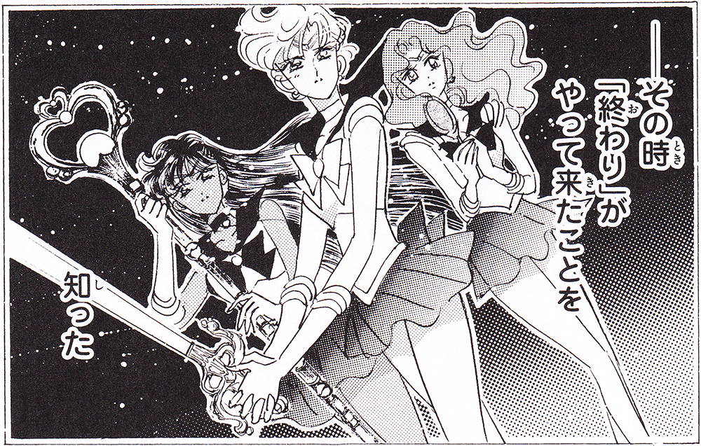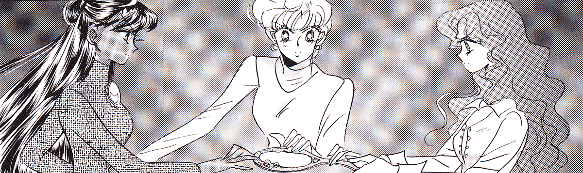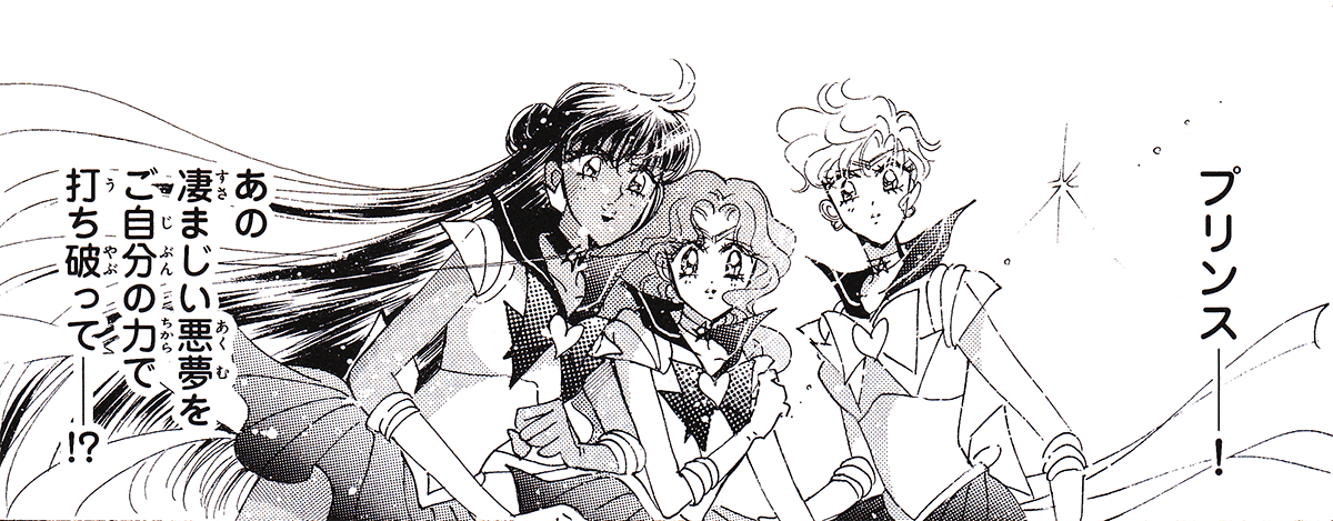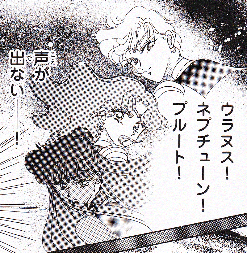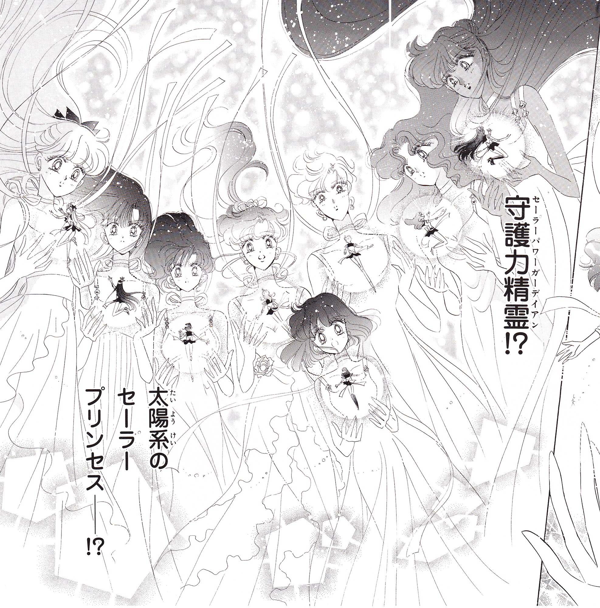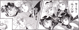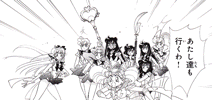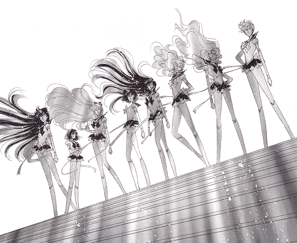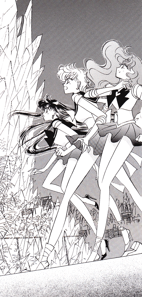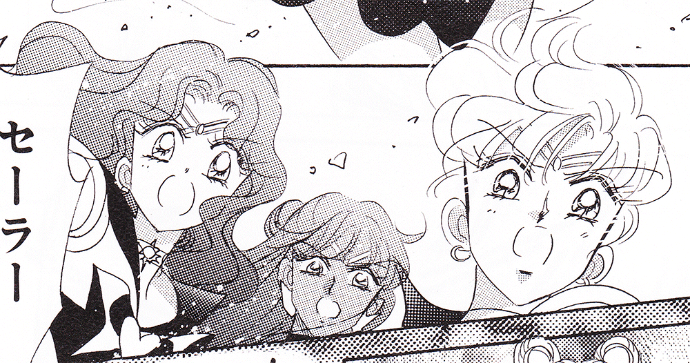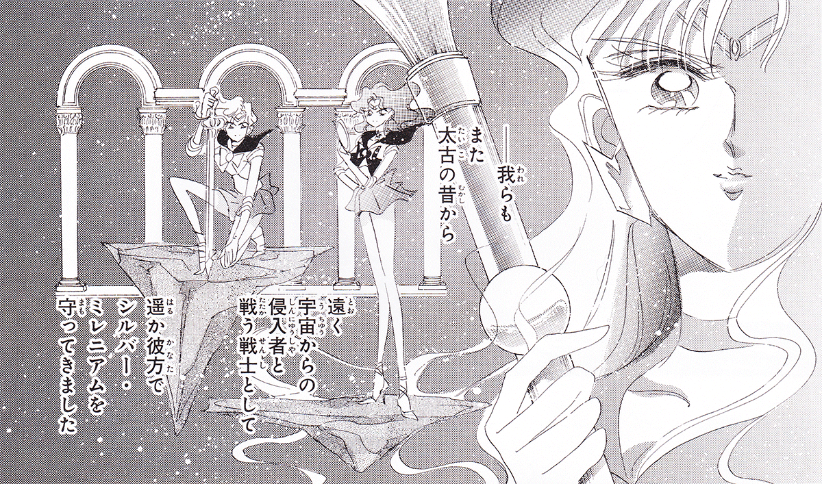 Black & white manga images of Haruka, Michiru & others.