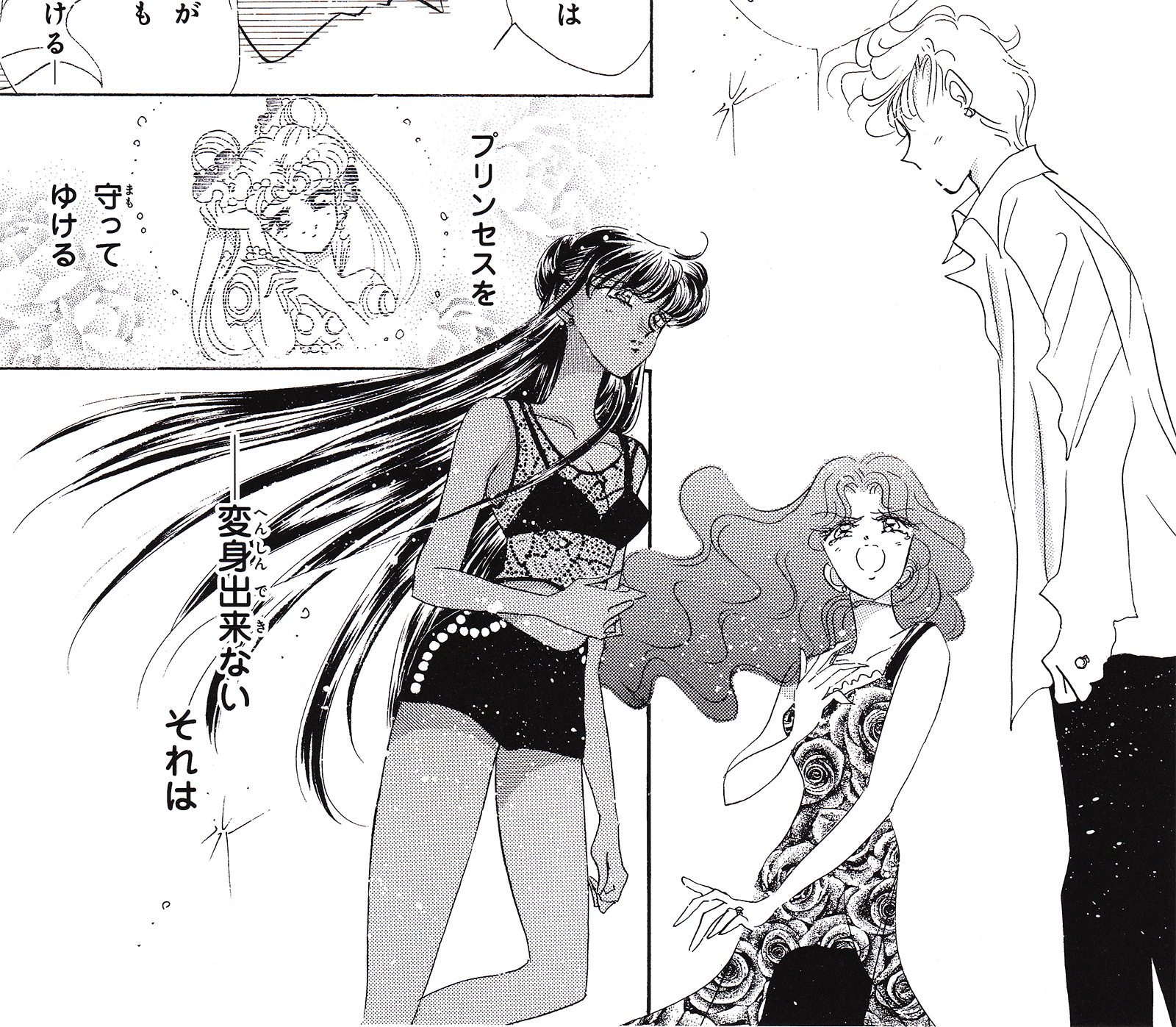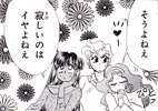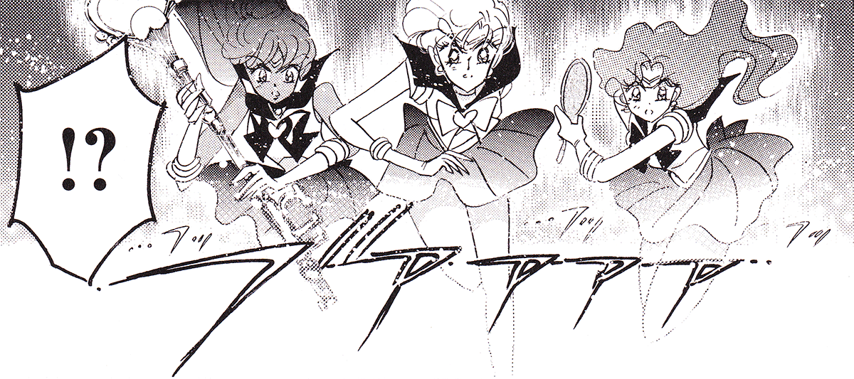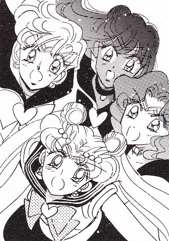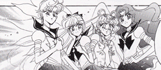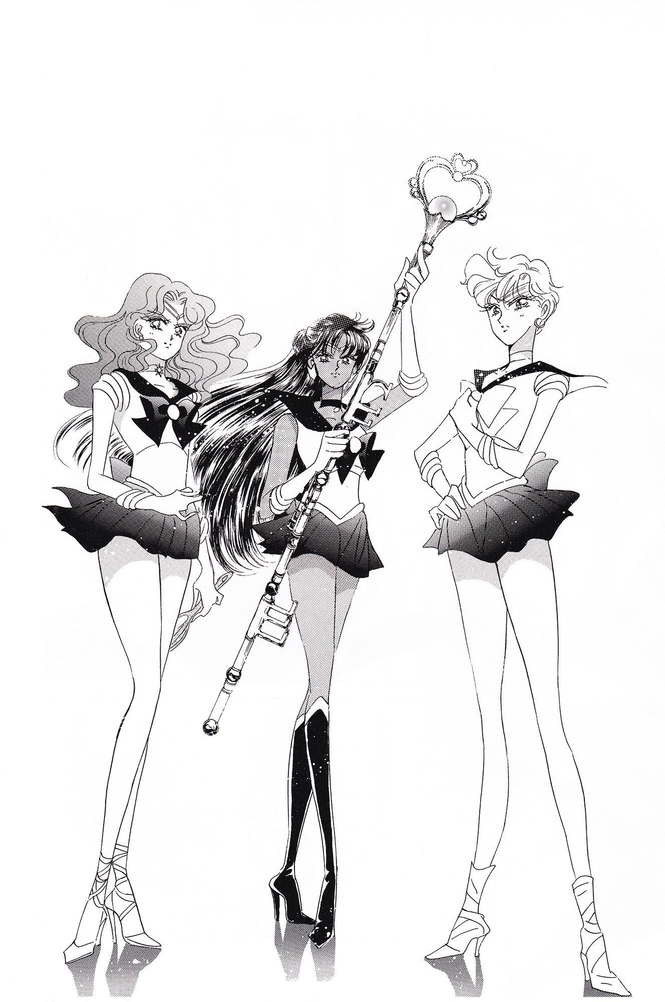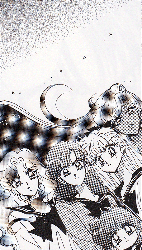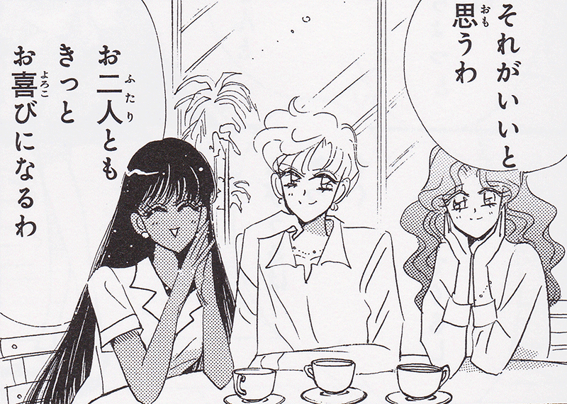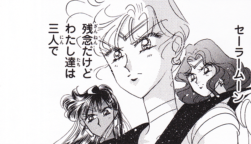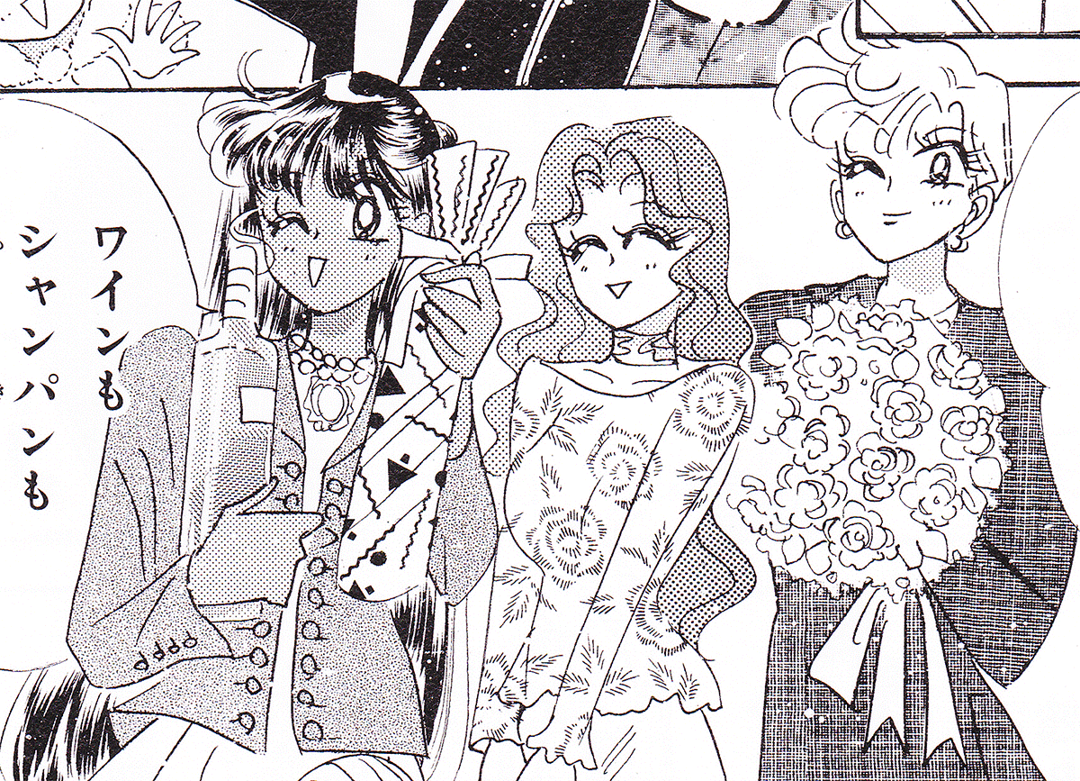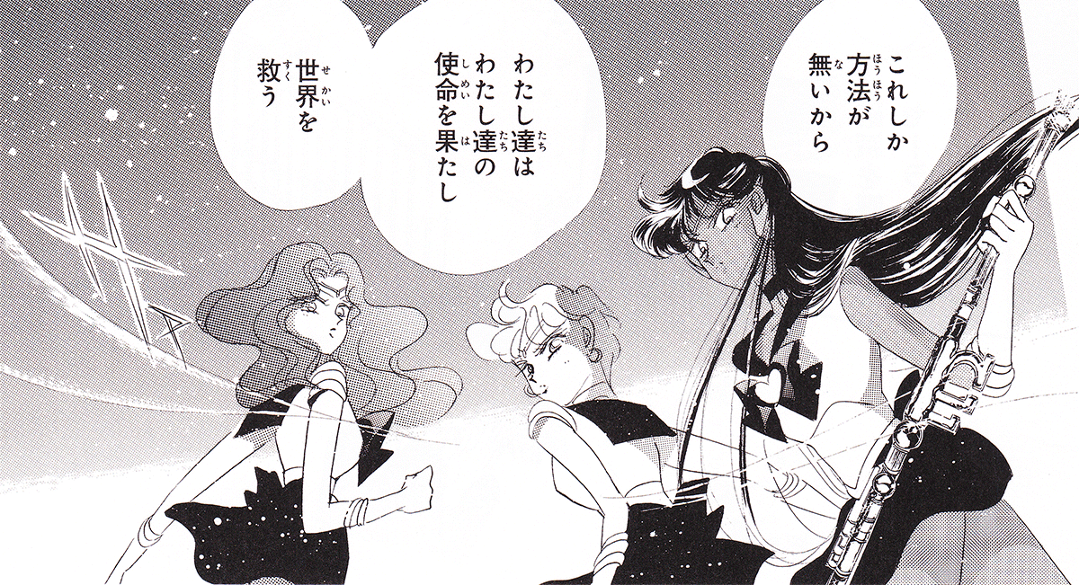 Black & white manga images of Haruka, Michiru & others.
