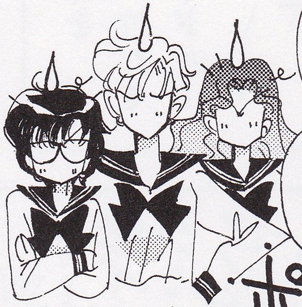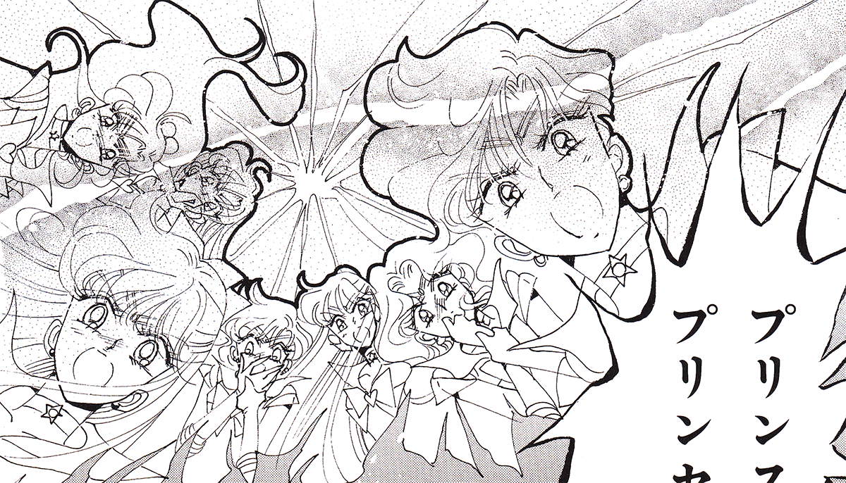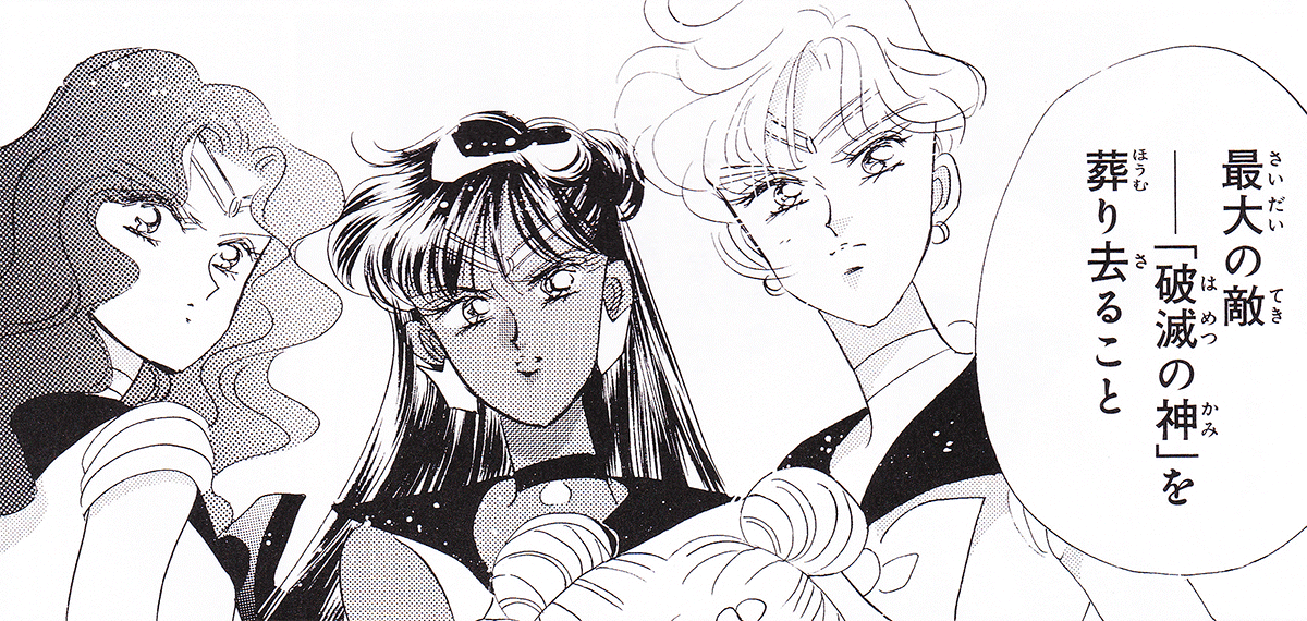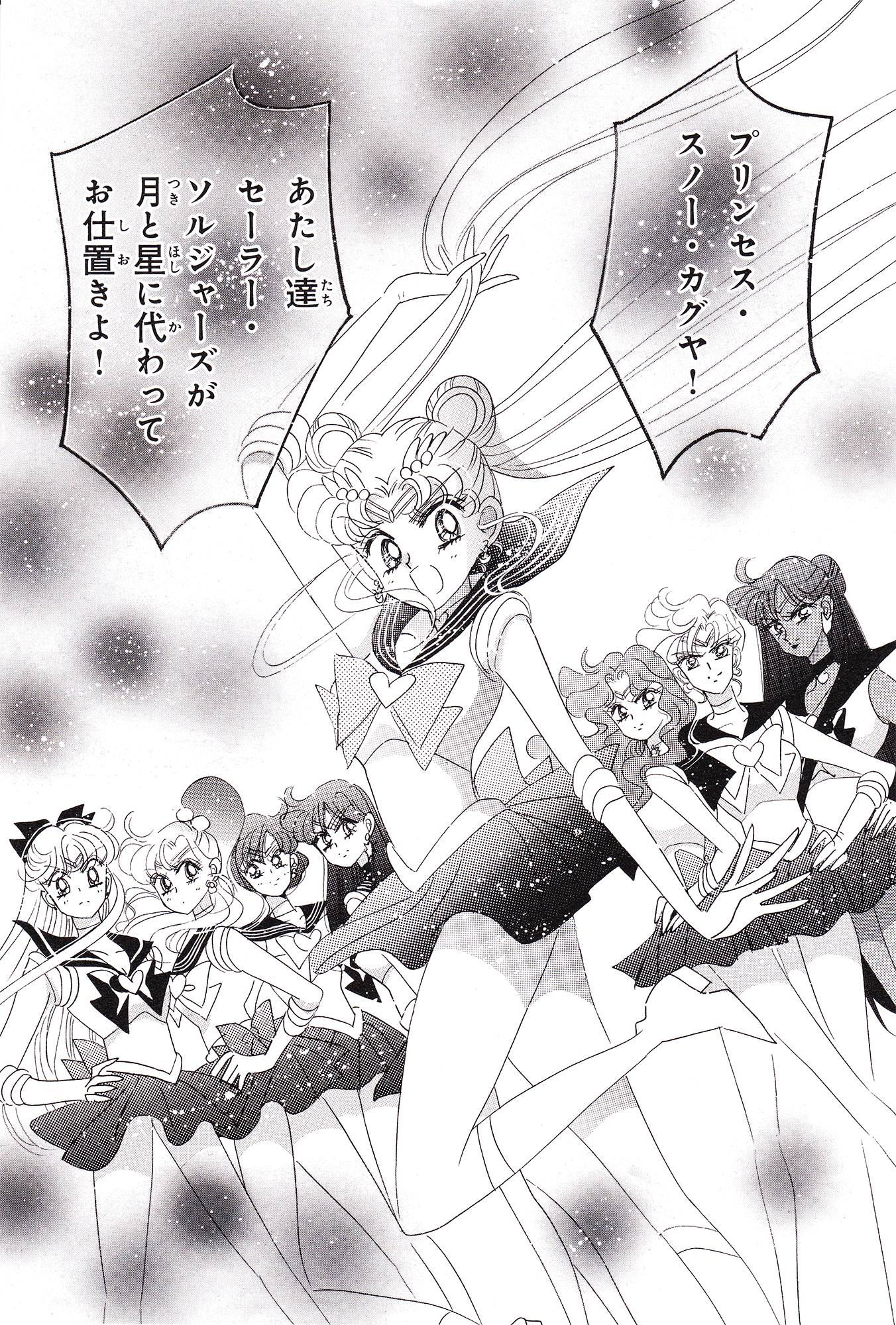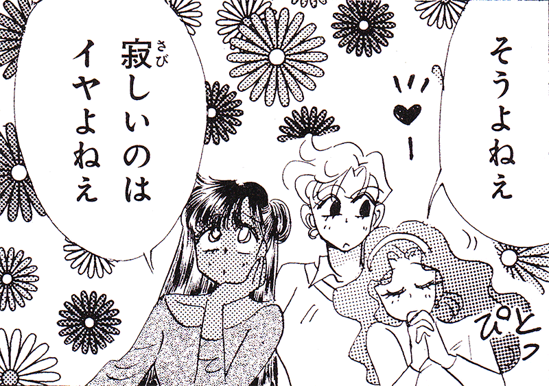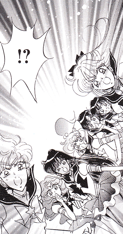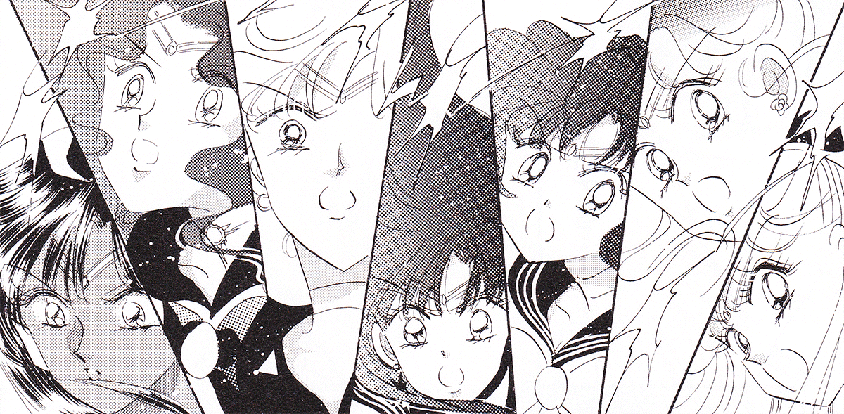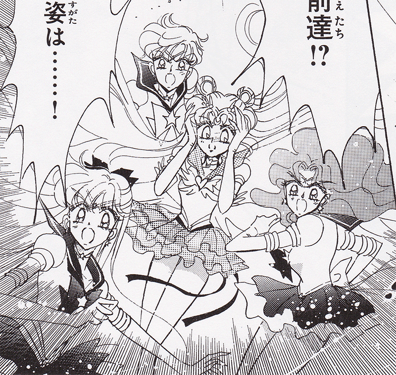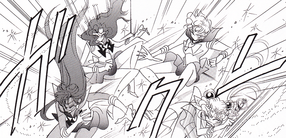 Black & white manga images of Haruka, Michiru & others.