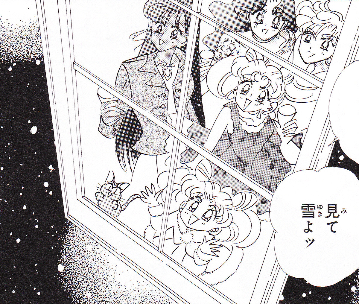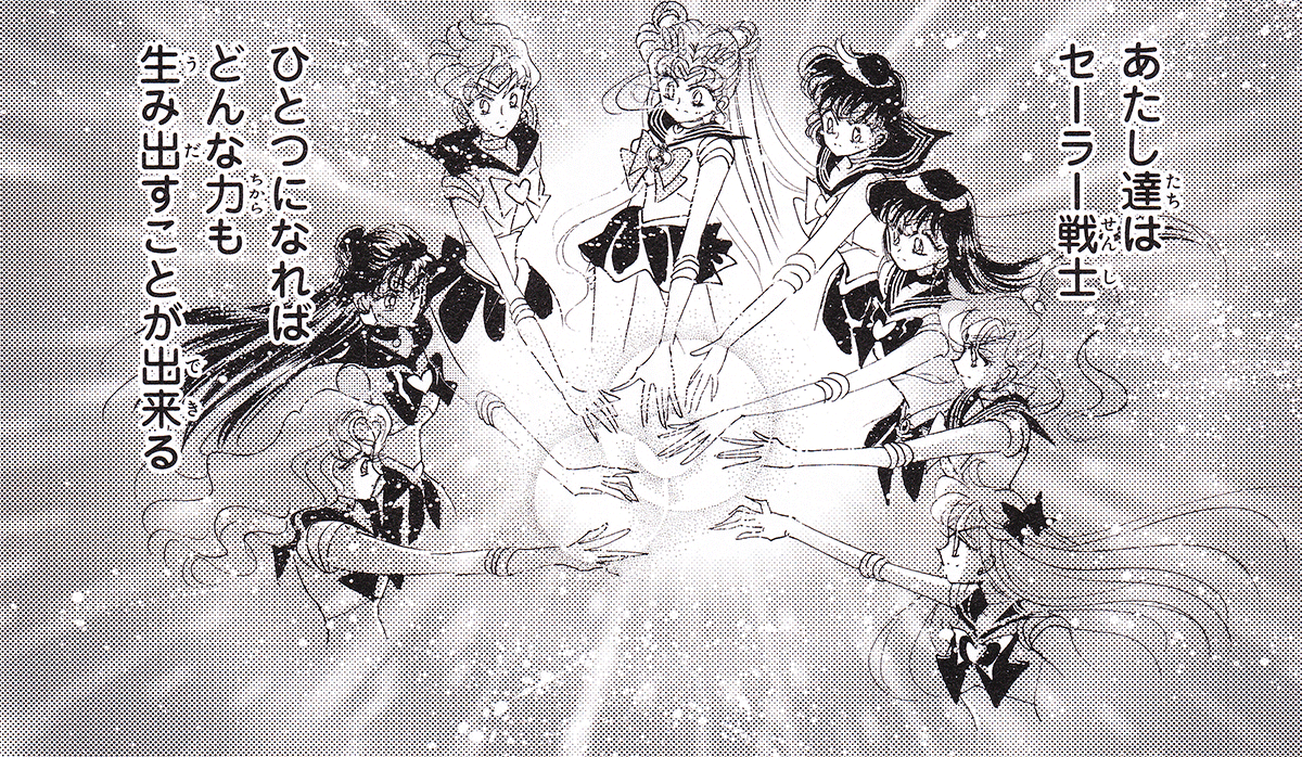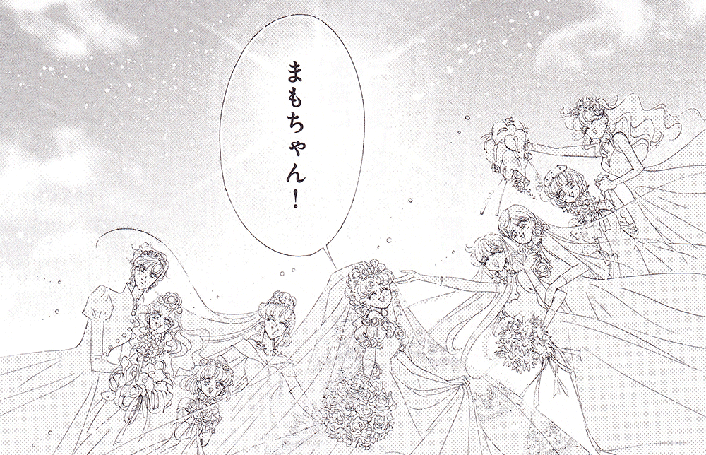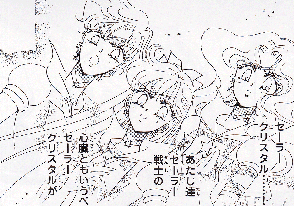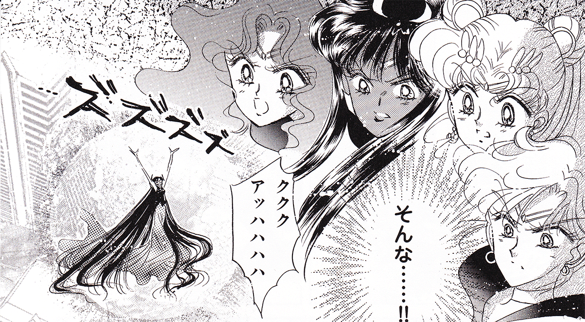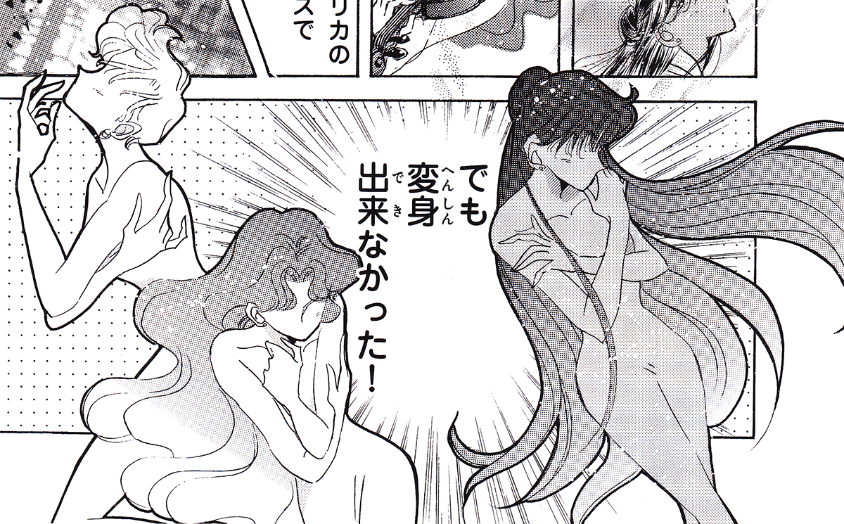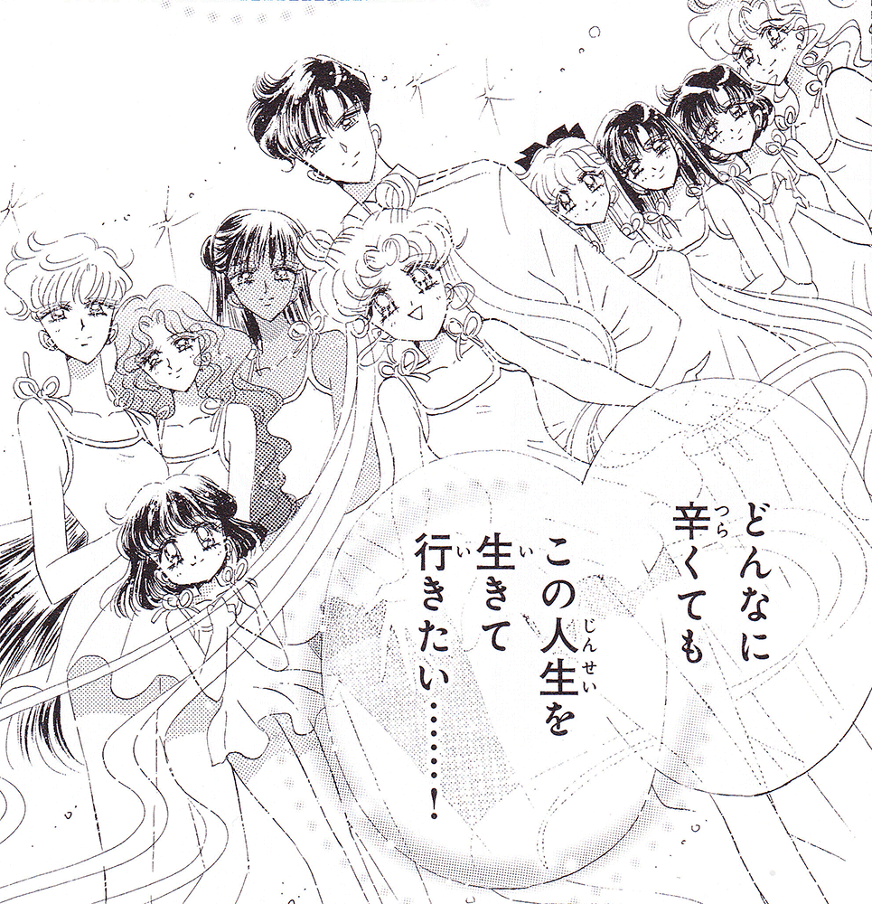 Black & white manga images of Haruka, Michiru & others.