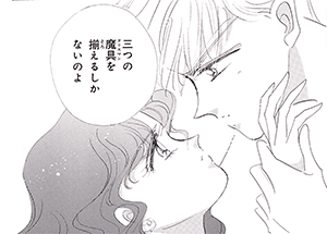 Haruka asks Michiru what's wrong; she says that she tried to do some fortune telling with her mirror and it went cloudy. Haruka then embraces Michiru from behind and says what they're doing could be for nothing and they could already be too late. Michiru consoles her and says there's nothing they can do; the wheels of fate have already been set in motion. As they pull away from a kiss, Michiru says that soon "she" will awaken and they'll have all three talismans.