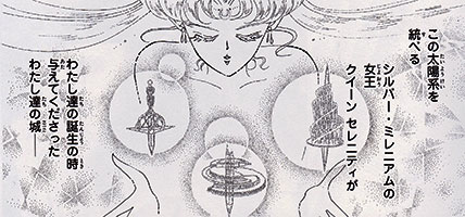 Named after the largest of Neptune's moons, Queen Serenity gave this castle to Princess Neptune. Triton Castle orbits the planet Neptune and appears as a platform with tall spires that gradually intertwine, forming a narrow, spiraling tower.